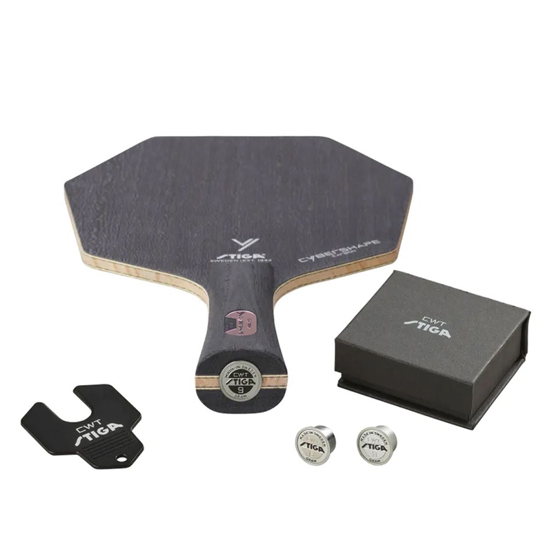 - Die Innovation STIGA Custom Weight Technology, um Gewicht und Schwerpunkt des Blattes mit drei Gewichten von 3, 6 und 9 Gramm einzustellen, die mit Hilfe eines Magneten im Blatt problemlos an der Unterseite des Griffs befestigen können, um die für Sie perfekten Eigenschaften Ihres STIGA-Blattes zu erreichen. Lesen Sie weiter unten auf dieser Seite mehr über die STIGA „Custom Weight Technology“!